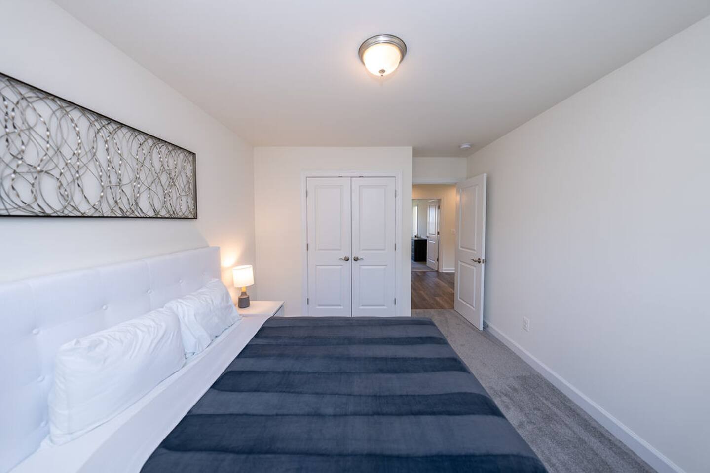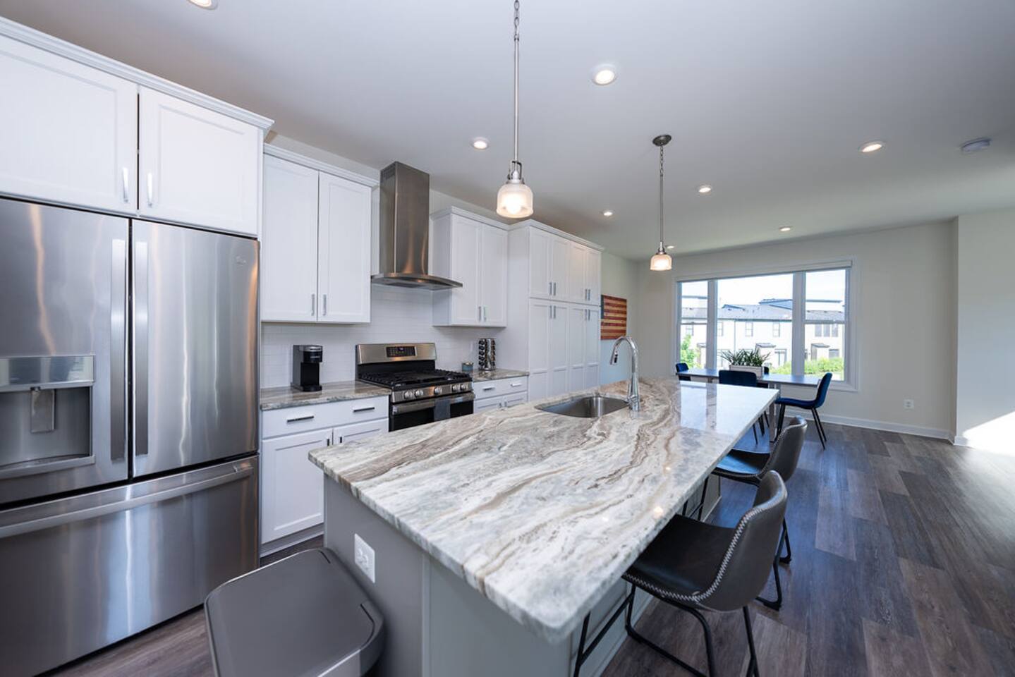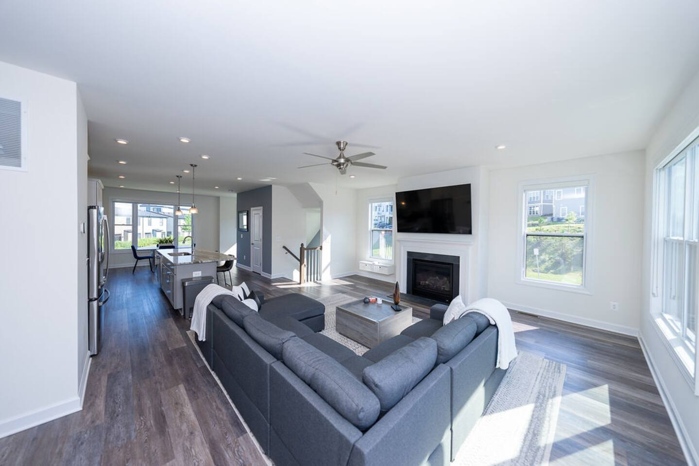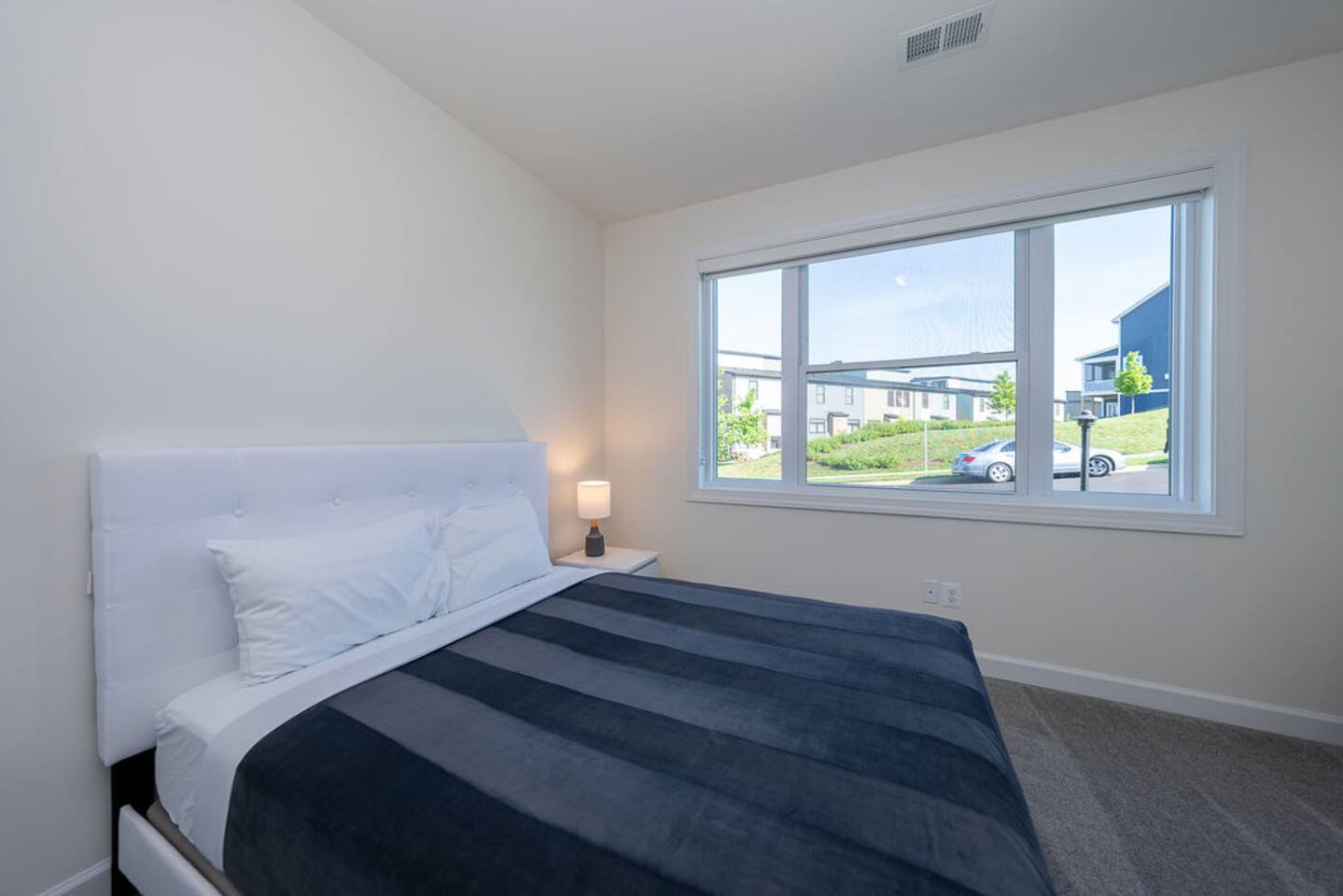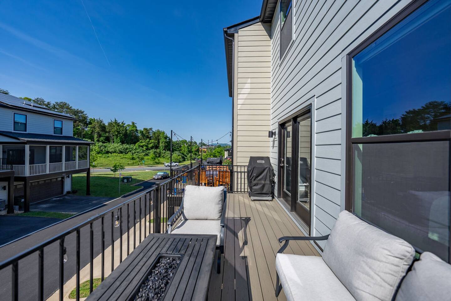 With its close proximity to downtown Charlottesville, this quiet residential attached Cascadia townhome is perfect for extended stay vacationing families or working professionals. Built in 2020, highlights of this fully furnished 2,140 sqft, 3-story end-unit townhome include: a light-filled interior, grey vinyl plank flooring, high ceilings, recessed lights, washer and dryer, upper outdoors deck, and an attached two car rear-entry garage. As you enter from the garage, there is a downstairs bedroom with queen bed and an en-suite bathroom with shower/tub combo. Up one floor is the main living area of the home, which offers an open and bright floor plan with Living Room, large grey sectional couch centered around an inviting gas fireplace and 75” Smart TV. Black-out shades throughout the house make it easy to enjoy the beautiful views or watch your favorite shows during the day. French doors open to the 10’ x 20’ large patio with furniture, a fire-pit, BBQ, and string lights to enjoy wonderful evening views outside! The adjoining kitchen offers stainless appliances, granite countertops, a large center island with bar seating for 2, contemporary dining table with seating for 4, and a pantry with tucked in microwave. All plates, utensils, kitchen tools, pots/pans, and basic spices are provided for you to use during your stay. The top floor includes a carpeted primary bedroom with a walk-in closet, King bed, and an en-suite bath with walk-in shower. There are two additional carpeted bedrooms, with one of the bedrooms currently setup as a home office. This floor also has a full laundry area with a washer and gas dryer, as well as a hallway bath with dual-sinks and a shower/tub combo. 1GB internet speeds allow for multiple devices to be in used at the same time and will be sufficient for most home-office needs. The windows are dual pane for maximum noise reduction and temperature control. All bedrooms, kitchen, and living room windows have blackout shades. We do not allow pets, smoking of any kind, events, parties or overnight guests not on the reservation.