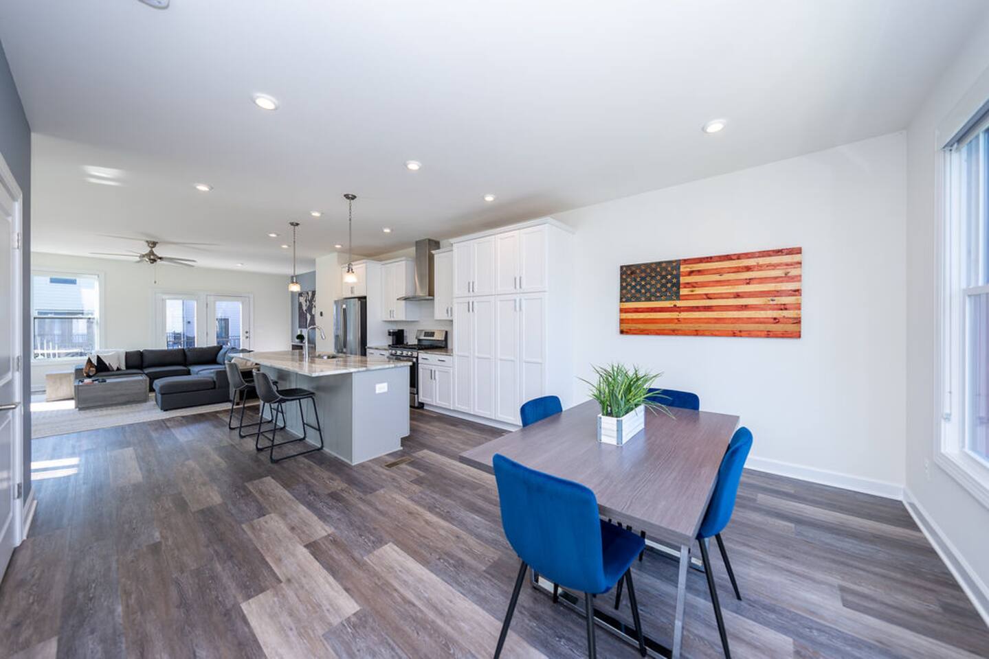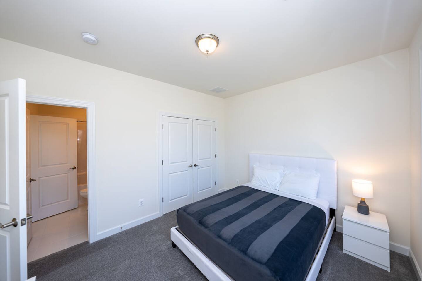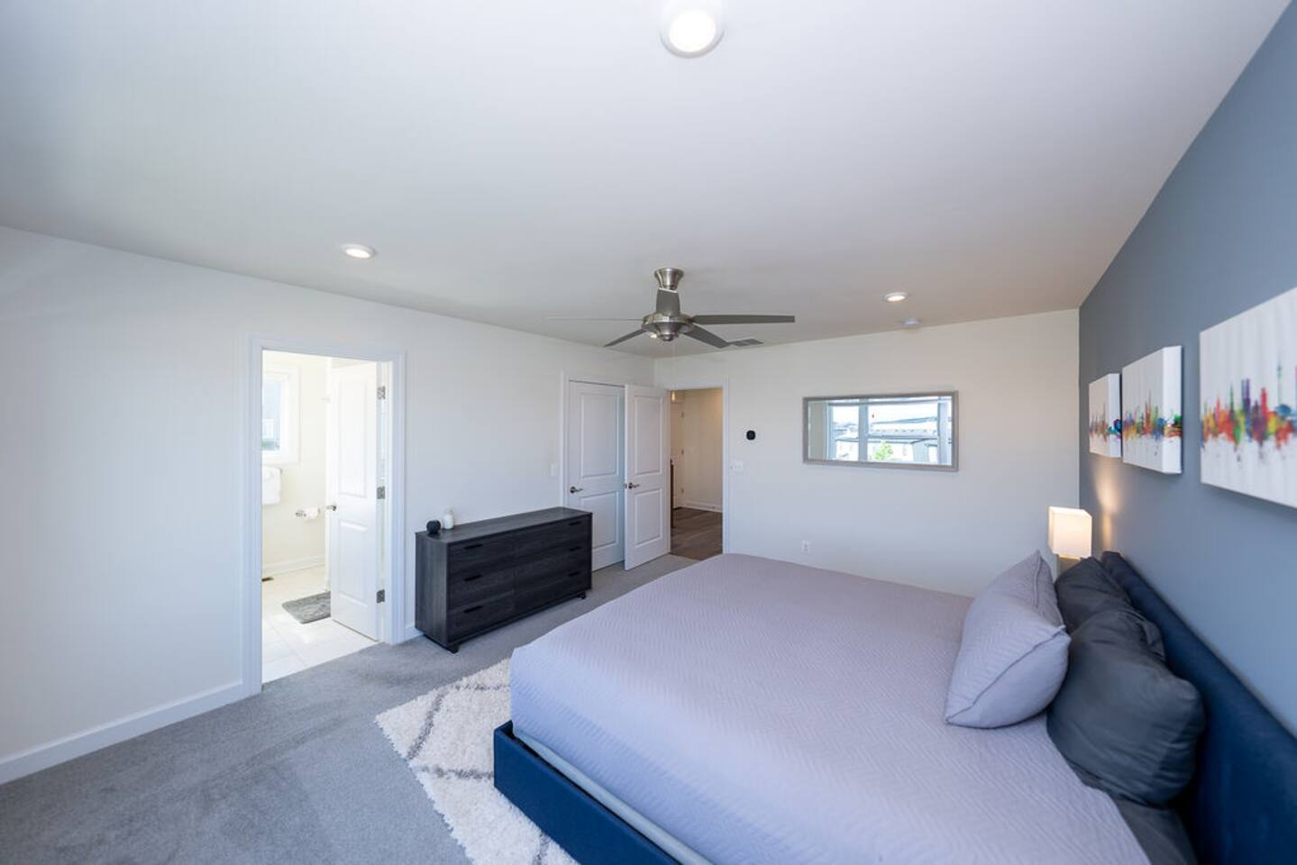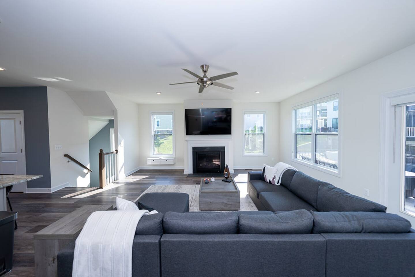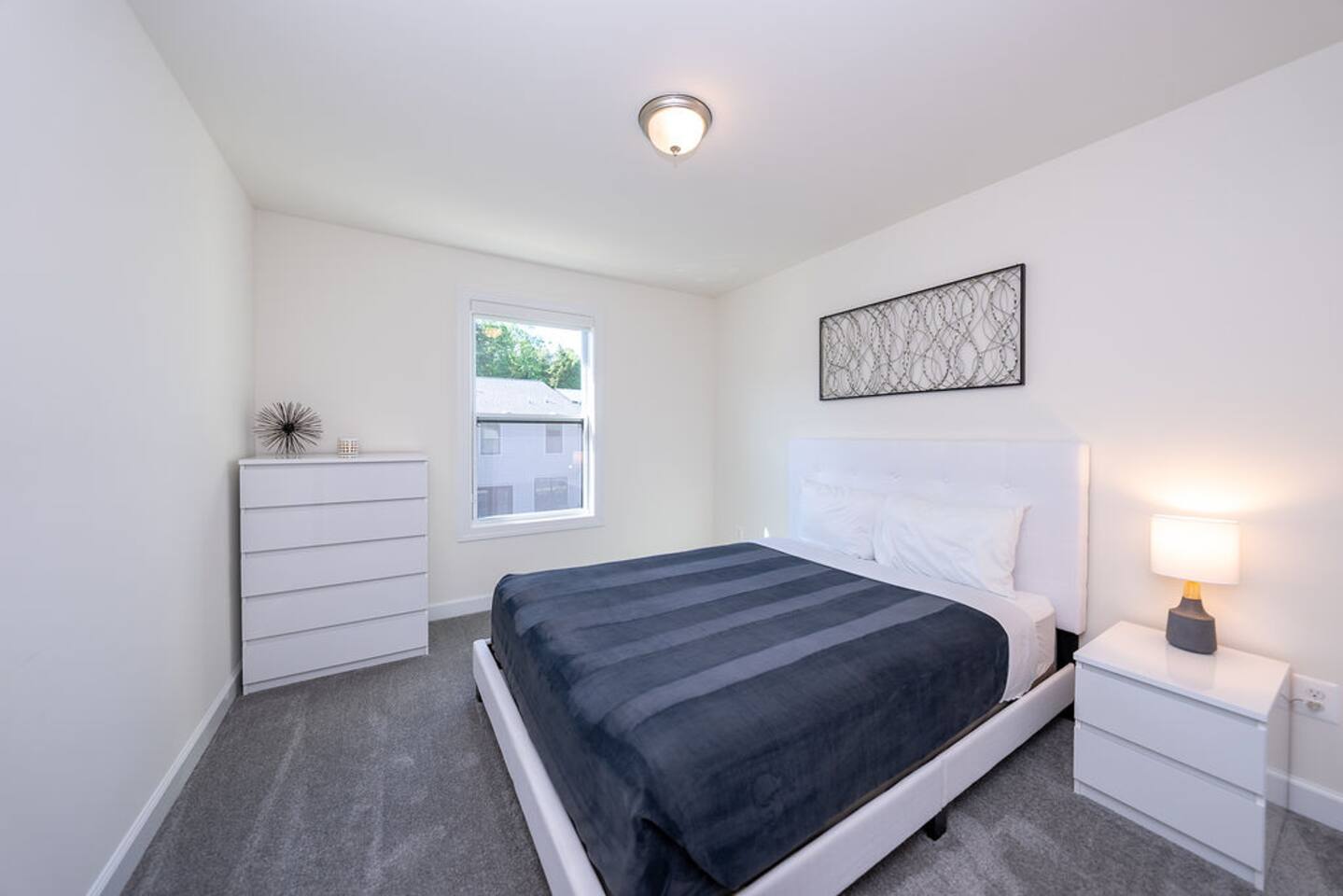 With its close proximity to downtown Charlottesville, this quiet residential attached Cascadia townhome is perfect for extended stay vacationing families or working professionals. Built in 2020, highlights of this fully furnished 2,140 sqft, 3-story end-unit townhome include: a light-filled interior, grey vinyl plank flooring, high ceilings, recessed lights, washer and dryer, upper outdoors deck, and an attached two car rear-entry garage. As you enter from the garage, there is a downstairs bedroom with queen bed and an en-suite bathroom with shower/tub combo. Up one floor is the main living area of the home, which offers an open and bright floor plan with Living Room, large grey sectional couch centered around an inviting gas fireplace and 75” Smart TV. Black-out shades throughout the house make it easy to enjoy the beautiful views or watch your favorite shows during the day. French doors open to the 10’ x 20’ large patio with furniture, a fire-pit, BBQ, and string lights to enjoy wonderful evening views outside! The adjoining kitchen offers stainless appliances, granite countertops, a large center island with bar seating for 2, contemporary dining table with seating for 4, and a pantry with tucked in microwave. All plates, utensils, kitchen tools, pots/pans, and basic spices are provided for you to use during your stay. The top floor includes a carpeted primary bedroom with a walk-in closet, King bed, and an en-suite bath with walk-in shower. There are two additional carpeted bedrooms, with one of the bedrooms currently setup as a home office. This floor also has a full laundry area with a washer and gas dryer, as well as a hallway bath with dual-sinks and a shower/tub combo. 1GB internet speeds allow for multiple devices to be in used at the same time and will be sufficient for most home-office needs. The windows are dual pane for maximum noise reduction and temperature control. All bedrooms, kitchen, and living room windows have blackout shades. We do not allow pets, smoking of any kind, events, parties or overnight guests not on the reservation.