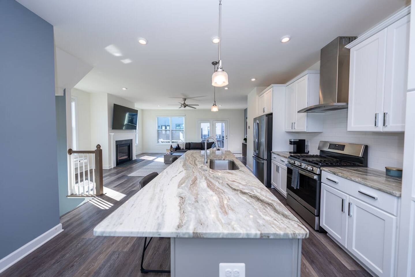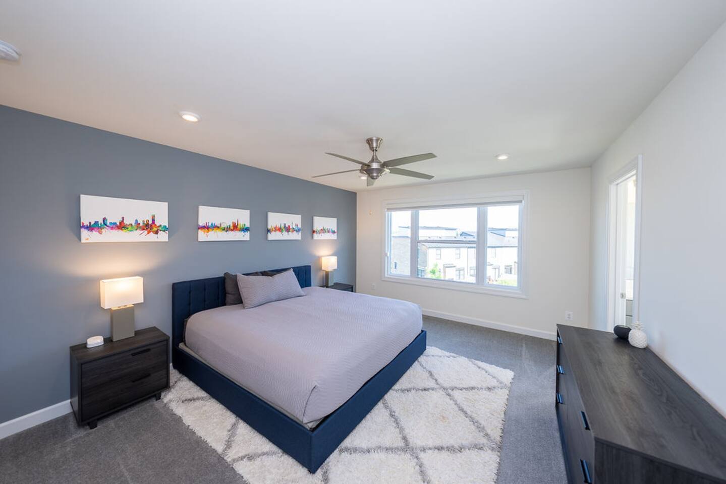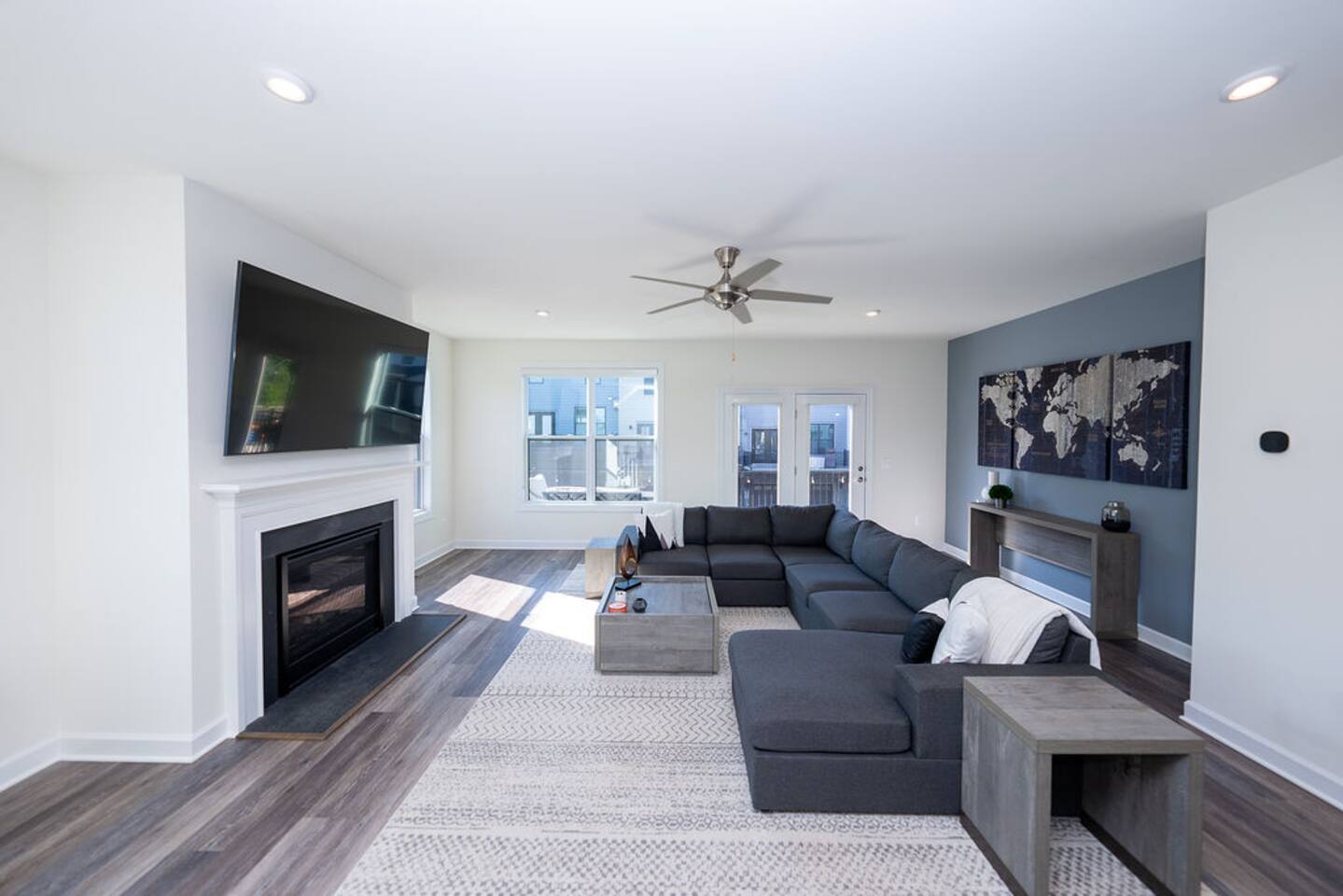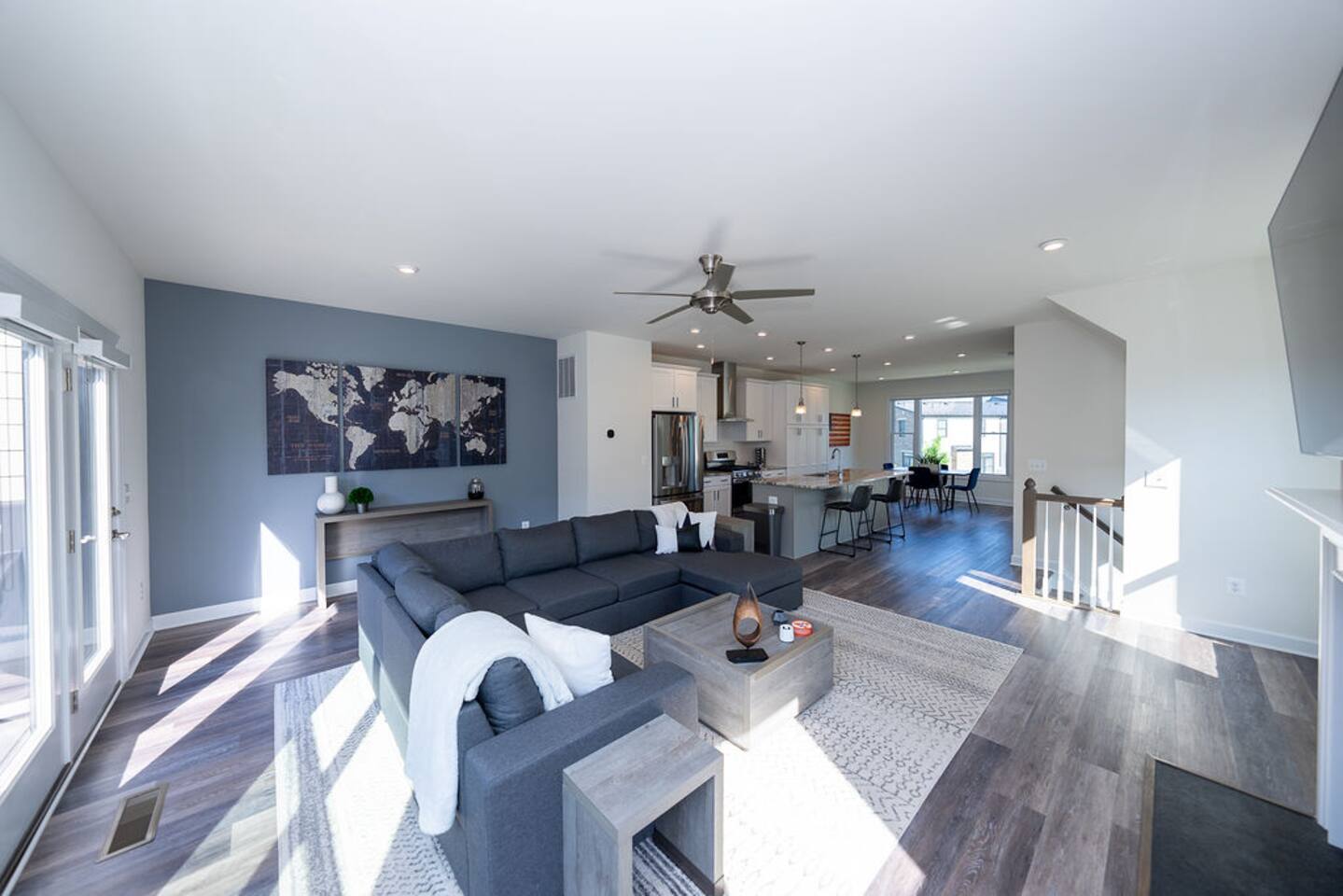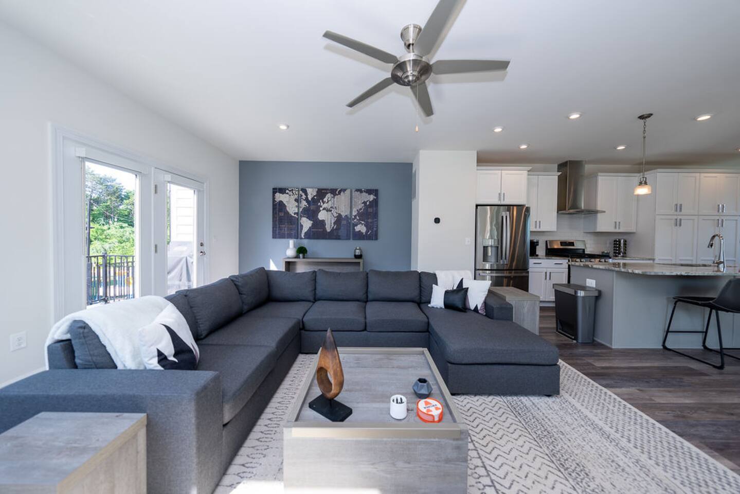 With its close proximity to downtown Charlottesville, this quiet residential attached Cascadia townhome is perfect for extended stay vacationing families or working professionals. Built in 2020, highlights of this fully furnished 2,140 sqft, 3-story end-unit townhome include: a light-filled interior, grey vinyl plank flooring, high ceilings, recessed lights, washer and dryer, upper outdoors deck, and an attached two car rear-entry garage. As you enter from the garage, there is a downstairs bedroom with queen bed and an en-suite bathroom with shower/tub combo. Up one floor is the main living area of the home, which offers an open and bright floor plan with Living Room, large grey sectional couch centered around an inviting gas fireplace and 75” Smart TV. Black-out shades throughout the house make it easy to enjoy the beautiful views or watch your favorite shows during the day. French doors open to the 10’ x 20’ large patio with furniture, a fire-pit, BBQ, and string lights to enjoy wonderful evening views outside! The adjoining kitchen offers stainless appliances, granite countertops, a large center island with bar seating for 2, contemporary dining table with seating for 4, and a pantry with tucked in microwave. All plates, utensils, kitchen tools, pots/pans, and basic spices are provided for you to use during your stay. The top floor includes a carpeted primary bedroom with a walk-in closet, King bed, and an en-suite bath with walk-in shower. There are two additional carpeted bedrooms, with one of the bedrooms currently setup as a home office. This floor also has a full laundry area with a washer and gas dryer, as well as a hallway bath with dual-sinks and a shower/tub combo. 1GB internet speeds allow for multiple devices to be in used at the same time and will be sufficient for most home-office needs. The windows are dual pane for maximum noise reduction and temperature control. All bedrooms, kitchen, and living room windows have blackout shades. We do not allow pets, smoking of any kind, events, parties or overnight guests not on the reservation.