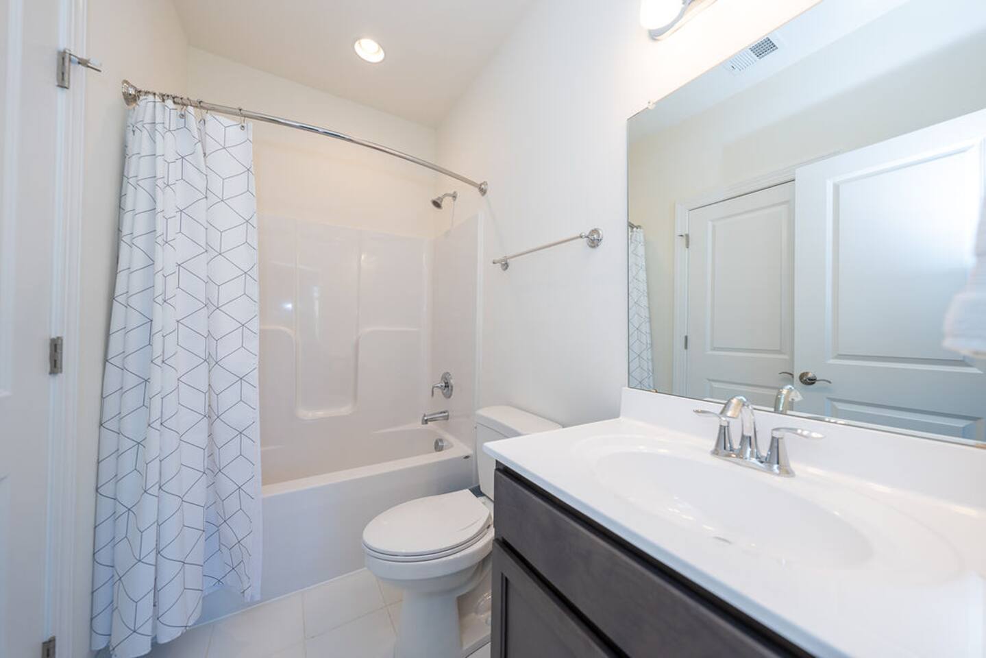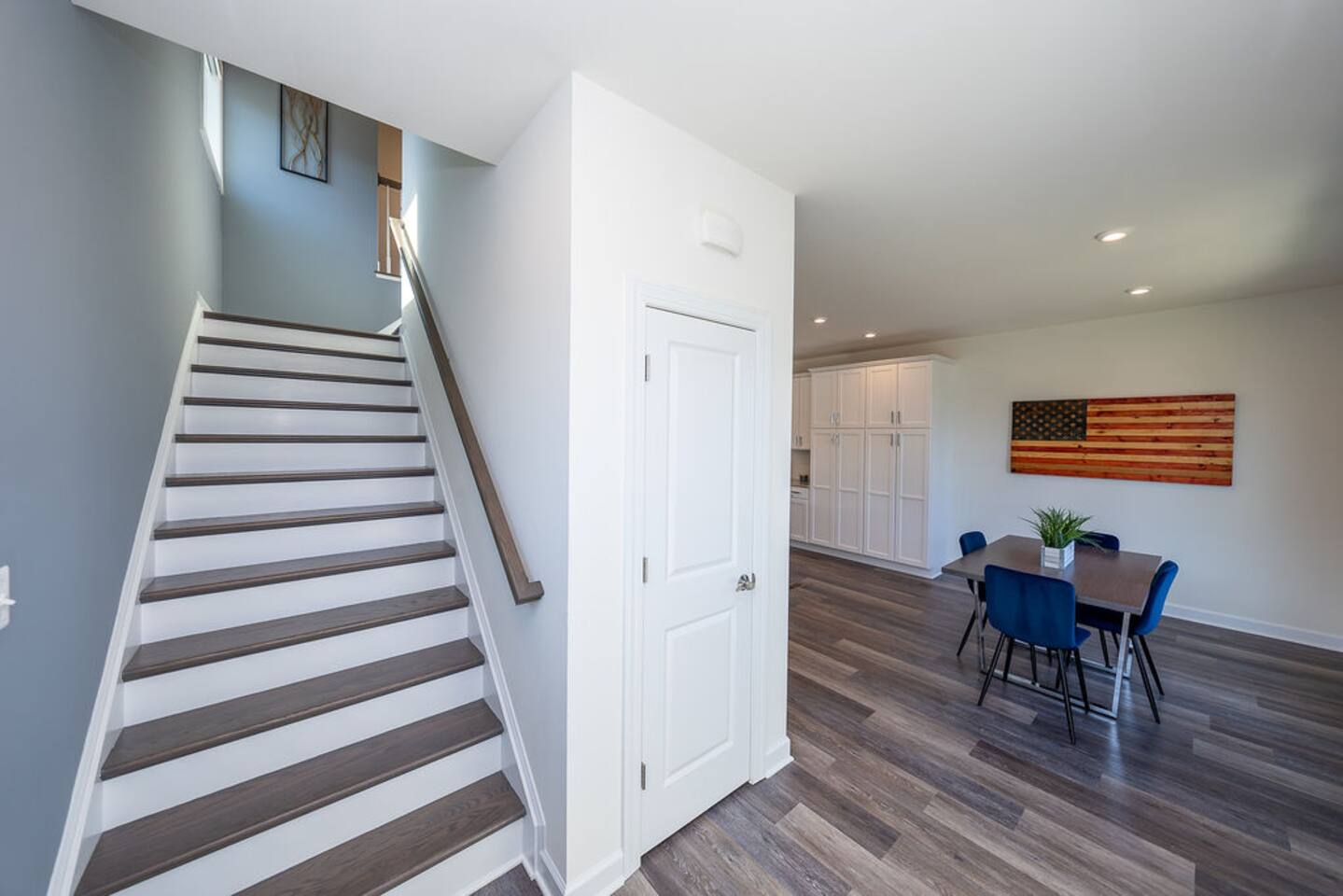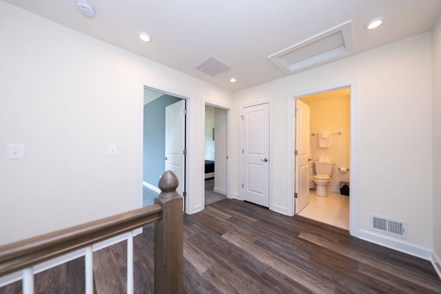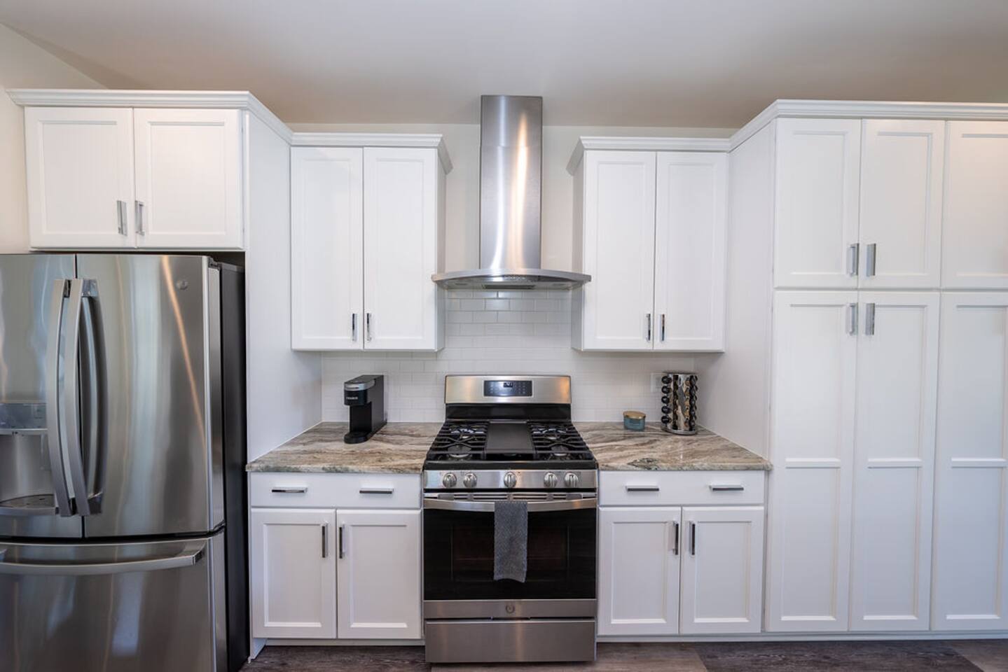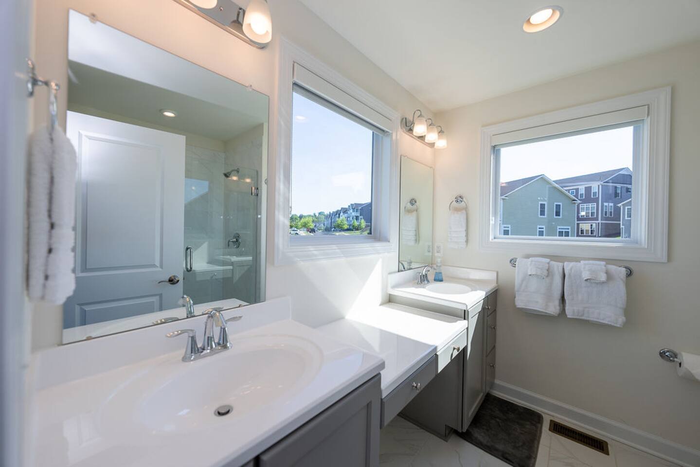 With its close proximity to downtown Charlottesville, this quiet residential attached Cascadia townhome is perfect for extended stay vacationing families or working professionals. Built in 2020, highlights of this fully furnished 2,140 sqft, 3-story end-unit townhome include: a light-filled interior, grey vinyl plank flooring, high ceilings, recessed lights, washer and dryer, upper outdoors deck, and an attached two car rear-entry garage. As you enter from the garage, there is a downstairs bedroom with queen bed and an en-suite bathroom with shower/tub combo. Up one floor is the main living area of the home, which offers an open and bright floor plan with Living Room, large grey sectional couch centered around an inviting gas fireplace and 75” Smart TV. Black-out shades throughout the house make it easy to enjoy the beautiful views or watch your favorite shows during the day. French doors open to the 10’ x 20’ large patio with furniture, a fire-pit, BBQ, and string lights to enjoy wonderful evening views outside! The adjoining kitchen offers stainless appliances, granite countertops, a large center island with bar seating for 2, contemporary dining table with seating for 4, and a pantry with tucked in microwave. All plates, utensils, kitchen tools, pots/pans, and basic spices are provided for you to use during your stay. The top floor includes a carpeted primary bedroom with a walk-in closet, King bed, and an en-suite bath with walk-in shower. There are two additional carpeted bedrooms, with one of the bedrooms currently setup as a home office. This floor also has a full laundry area with a washer and gas dryer, as well as a hallway bath with dual-sinks and a shower/tub combo. 1GB internet speeds allow for multiple devices to be in used at the same time and will be sufficient for most home-office needs. The windows are dual pane for maximum noise reduction and temperature control. All bedrooms, kitchen, and living room windows have blackout shades. We do not allow pets, smoking of any kind, events, parties or overnight guests not on the reservation.